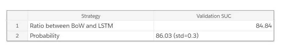 以上是在验证集中离散地选择使用 BoW 还是 LSTM 的策略结果。每一个模型会在不同 seed 的情况下计算十次。该表格中的结果是 SUC 的均值。概率策略(probability strategy)也会和比率(Ratio)相比较。