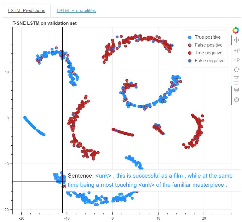 探索深度学习模型的一种流行的方法是了解每个句子在隐藏层中是如何表示的。但是,因为隐藏层常常是高维的,所以我们可以使用 T-SNE 这样的算法来将其降至 2 维,从而让我们可以绘制图表供人类观察。