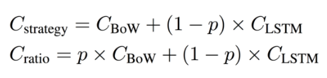 为了构建基线(baseline),我们需要考虑两个模型之间的比率。例如词袋(BoW)使用 0.1 的数据就相当于 0.9 倍 LSTM 的准确率和 0.1 倍 BoW 的准确率。其目的是取得没有指导策略(guided strategy)的基线,从而在句子中使用 BoW 或 LSTM 的选择是随机分配的。然而,使用策略时是有成本的。我们必须首先通过 BoW 模型处理所有的句子,从而确定我们是否该使用 BoW 或 LSTM。在没有句子达到概率阀值(probability threshold)的情况下,我们可以不需要什么理由运行额外的模型。为了体现这一点,我们从以下方式计算策略成本与比率。
