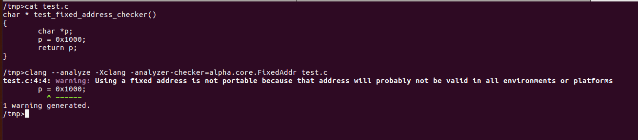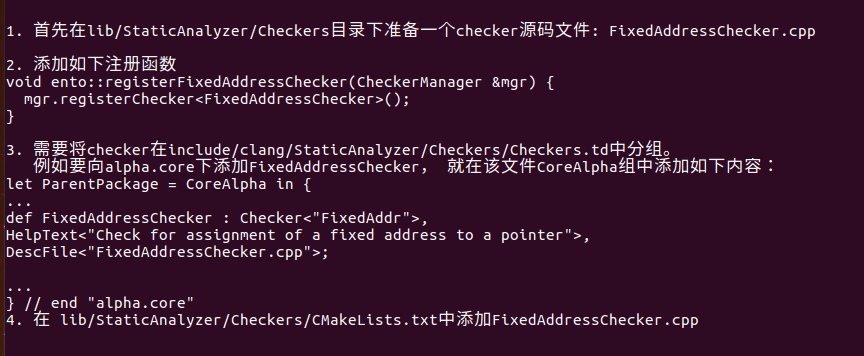 Clang/llvm项目编译方面的步骤可参看官方文档。关于checker的编写,clang项目下StaticAnalyzer/Checkers目录中有不少实例可以参考。这里用一个最简单的例子来熟悉checker的创建:FixedAddressChecker,这个checker将检查出所有直接向指针赋值常量的操作并报警,该checker甚至没有涉及使用模拟执行的部分。