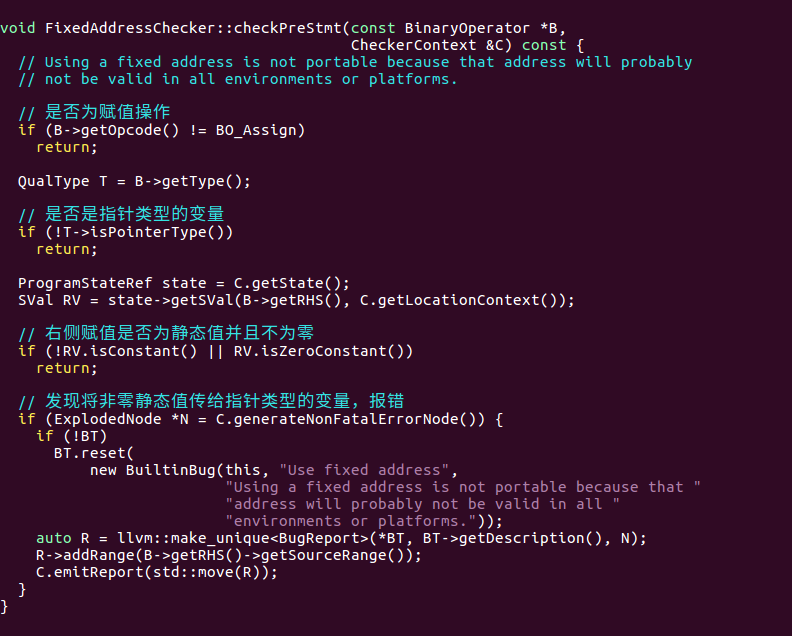 所有自定义的checker类都需要继承Checker模板类,并通过实现不同的事件注册函数来挂钩analyzer core分析过程,所有支持的事件类型可以在CheckerDocumentation.cpp中查阅。FixedAddressCheck类通过实现checkPreStmt函数捕捉代码中的赋值操作,下面是加上注释的代码: