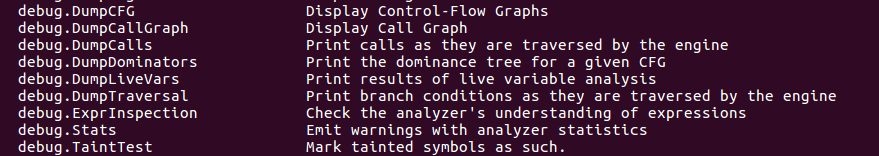 除了正常功能的checker,debug分组的checker可以帮助开发者了解分析引擎在处理源代码过程中的逻辑,例如以下一些checker: