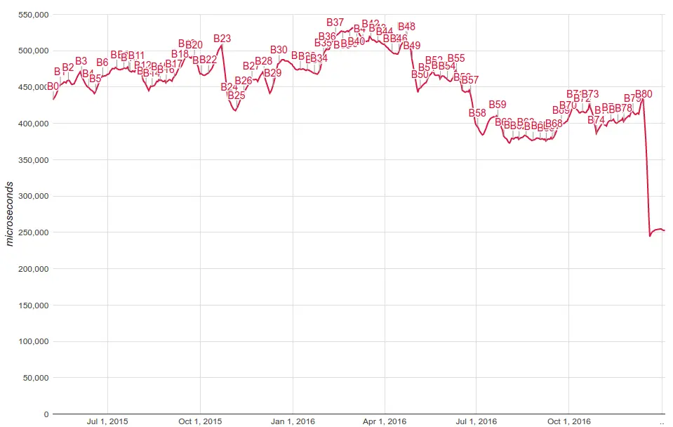 下面的图标展示了出现率最高的1%滚动操作所花费的时间, 该时间代表一个用户从触摸屏幕来滑动到展示更新完成.这份数据针对于所有在安卓的Chrome中运行的网页.在这项干涉开启之前,1%的滚动操作花费略高于400ms.但是现在在Chrome 56 Beta中已经下降为略高于250ms;大概38%的一个降幅.在未来我们希望让所有的touchstart和touchmove监听器默认都是被动的,这样能将这个时间降低至50ms.