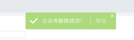 当用户进行了一些重要的操作时,为了防止用户误操作带来严重的后果,程序就会设置一种“撤销”的回退方式以让用户对误操作进行补救。比如下图,用户在多公众号系统中删除了公众号,删除成功时会出现删除成功的提示,同时会出现几秒的“撤销”按钮。生与死,就看这几秒了。