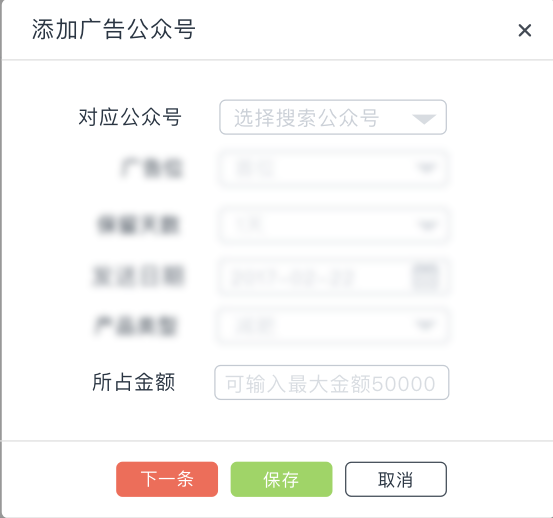 用户在使用产品时能够方便快捷的完成相关任务或动作,即让用户以最快最便捷的方式完成任务。如下图,图下方有一个“下一条”的按钮,这个按钮就是给用于提供一个快捷输入的入口,当用户添加完一个公众号后,可以点击下一条直接添加第二个公众号,不用再回到主页面点击添加再进行广告公众号的添加。