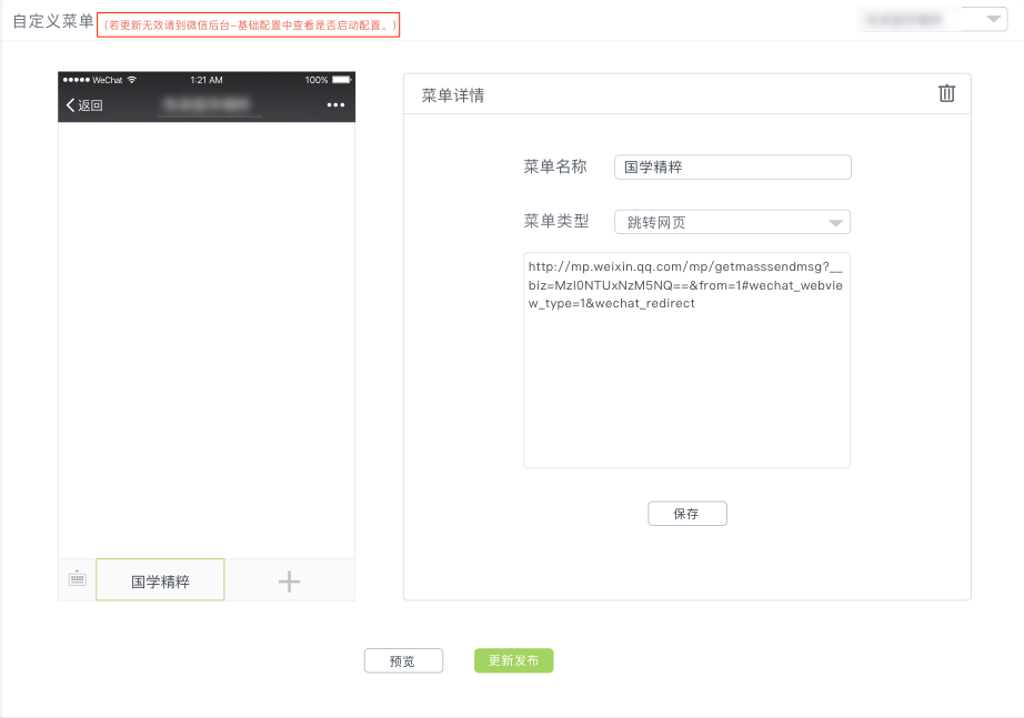 回想起自己对公众号管理系统1.0版本进行设计时,由于微信那边对第三方平台的限制,自定义菜单时需要用户跑到微信后台去填写配置信息,并且需要提交并启用配置。步骤相对较多,并且操作繁琐(当时有想过砍掉这个功能,但由于是客户提出的必要需求,只能从产品上改进)。后来为了防止用户忘了在后台配置相关信息而导致在我们系统中的操作无效,所以我们在对应的操作中添加了提示,便于用户可以找到正确的操作指引。