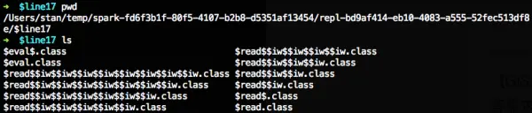 Spark2.1.0的REPL基于Scala-2.11的scala.tools.nsc编译工具实现,代码已经相当简洁,Spark给interp设置了2个关键的配置-Yrepl-class-based和-Yrepl-outdir,通过这两个配置,我们在shell中输入的代码会被编译为class文件输出到执行的文件夹中。如果指定了spark.repl.classdir配置,会用这个配置的路径作为class文件的输出路径,否则使用SPARK_LOCAL_DIRS对应的路径。下面是我测试过程中输出到文件夹中的class文件: