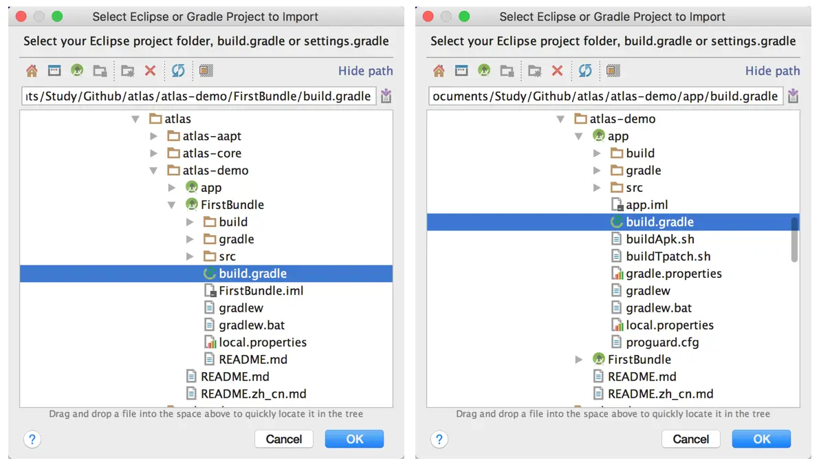 Android Studio:File->New->Import Project->分别导入FirstBundle和app工程,现在AS已经是2.3版本了,gradle也已经更新到3.3版本了,根据文档说明我们暂时不去动工程的其他配置,目的是让工程跑通,在此基础上进一步探索。