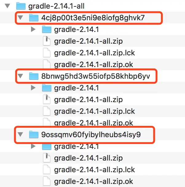 若本地未下载2.14.1版本的gradle可能要等好久,或者直接报错(Error:Cause: zip file is empty),OS系统可以到gradle文件夹:/Users/用户名/.gradle/wrapper/dists 查看有没有下好,如下因为依赖的是第三个文件夹下的gradle 然后一直下载不了,最后我是copy上面文件夹下的文件。也可以下载完放到对应目录