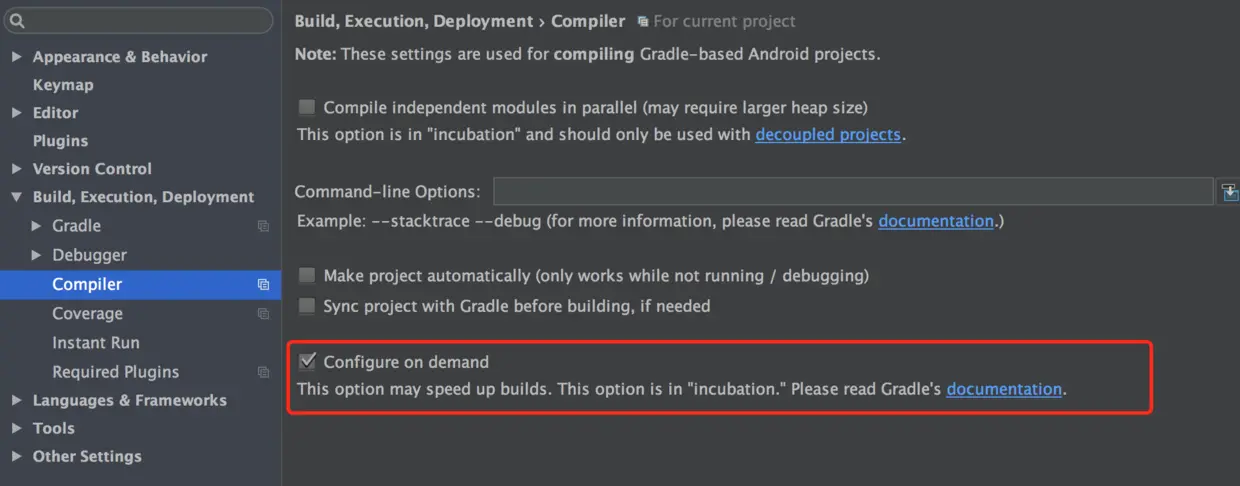 为了让Gradle能够确切的知道该如何构建你的APP,在每次构建之前,构建系统配置工程的所有modules和其他依赖(即使你只想构建或者测试一个modules),这使得大型的多module 工程的构建速度变得很慢。告诉Gradle仅仅配置你想要构建的Modules,用如下步骤使 on demand 配置可用
