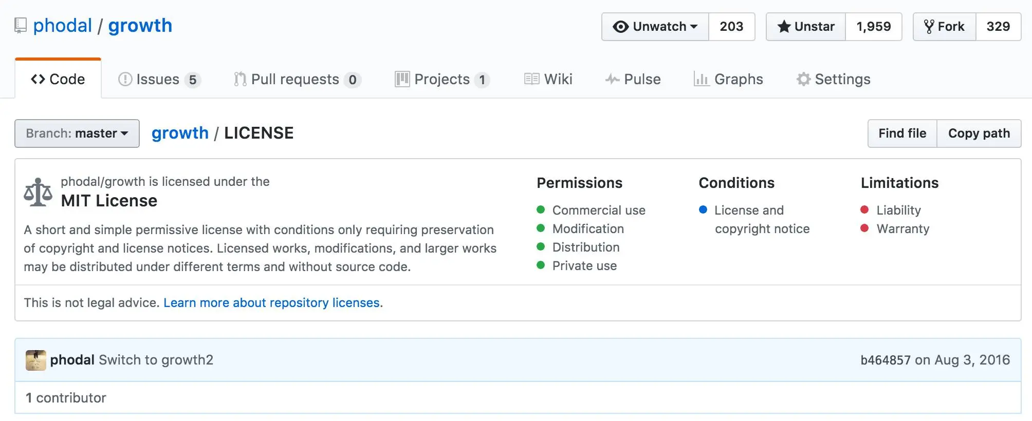 只需要打开一个 License 文件,如 Growth 项目,你就可以关于这个项目的 License 的相关简介情况。