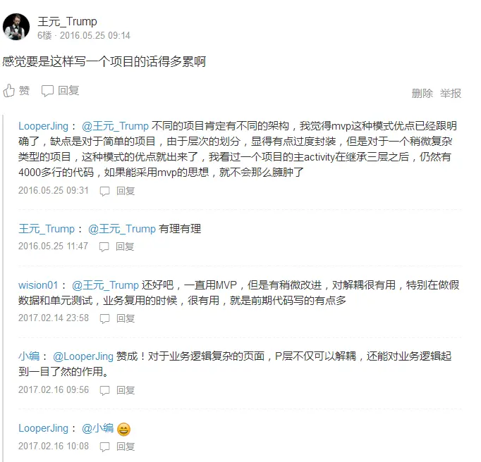 可见采用MVP模式之后,虽然类数量变大,但是逻辑更加清晰,遵守了高内聚,低耦合的设计原则,完全避免了几千行代码的Activity,这势必可以提交整个团队的开发效率。但是仍然美中不足,因为每个功能块的代码都是类似的,只是细节上会有所不同,正如上篇博客有些人评论就有问到这个问题。