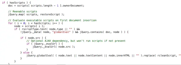 显然 jQuery 在这里完全没有考虑 <script> 前后的依赖。对于 inline script 的标签也是直接通过 eval 实现的而不是新建一个插入到文档里。