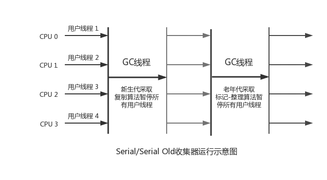 Serial是一个单线程的收集器,但它的“单线程”意义并不仅仅说明它只会使用一个CPU或一条手机此案成去完成垃圾和收集工作,更重要的是它进行垃圾收集时,必须暂停其他所有的工作线程,直到它收集结束。