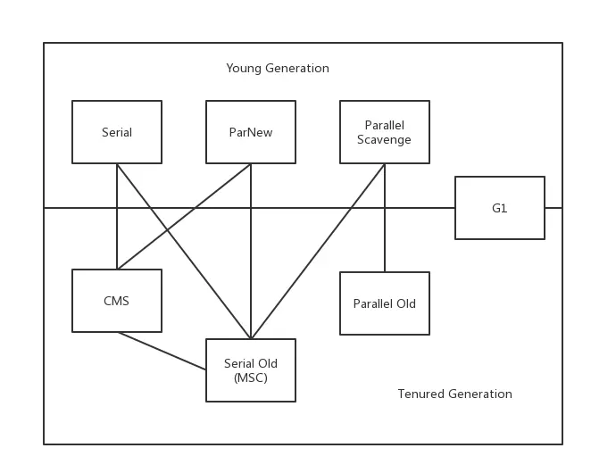 如果说垃圾收集算法是内存回收的方法论,那么垃圾收集器就是内存回收的具体实现。不同厂商不同版本的虚拟机所提供的垃圾收集器都可能有很大的差别,这里谈论的收集器基于JDK 1.7 Update 14之后的HotSpot虚拟机(在这个版本中正式提供了商用的G1收集器,之前的G1仍处于试验状态),这个虚拟机包含的所有收集器如下图所示。