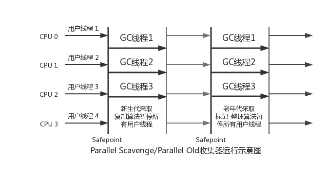 - 并行(Parallel):指多条垃圾收集线程并行工作,但此时用户线程仍然处于等待状态。