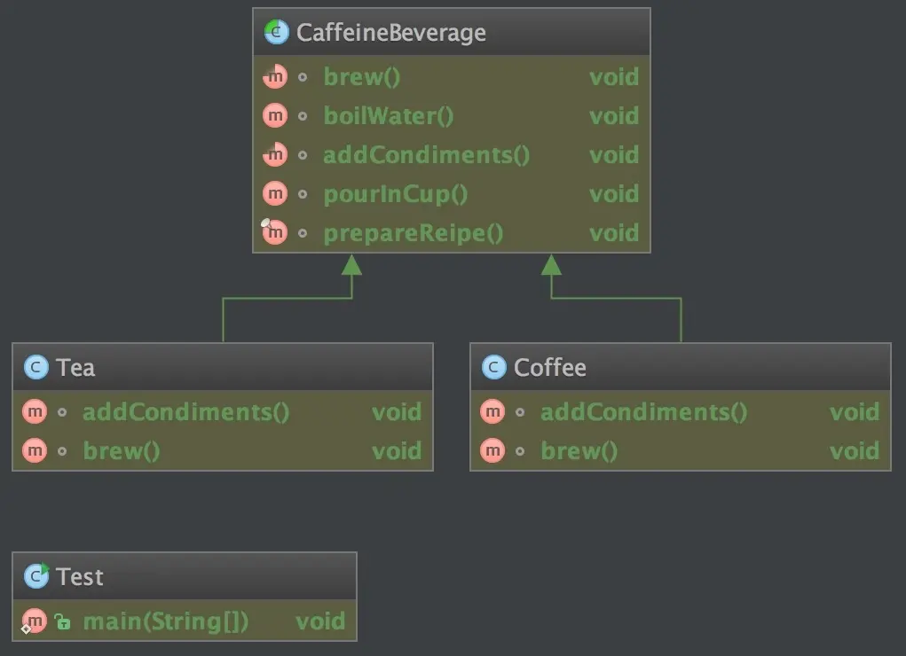这里简单通过一个示例来展示到底什么时候模板方法模式。这个示例向我们展示了制作咖啡和茶2种咖啡因饮料的过程,在这个过程中展示了模板方法模式的具体使用方法。 先看一下模板方法模式的类图: