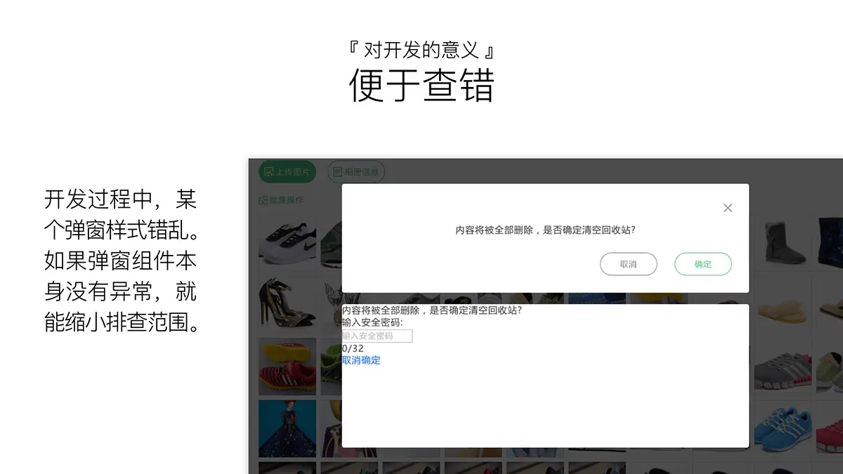 如果页面上出现问题,可以找出每个可能有关的组件,逐个拔除,直到恢复正常。这样就能迅速锁定错误发生的位置。同时组件内也可以形成完整的自测单元,也方便了测试工作。