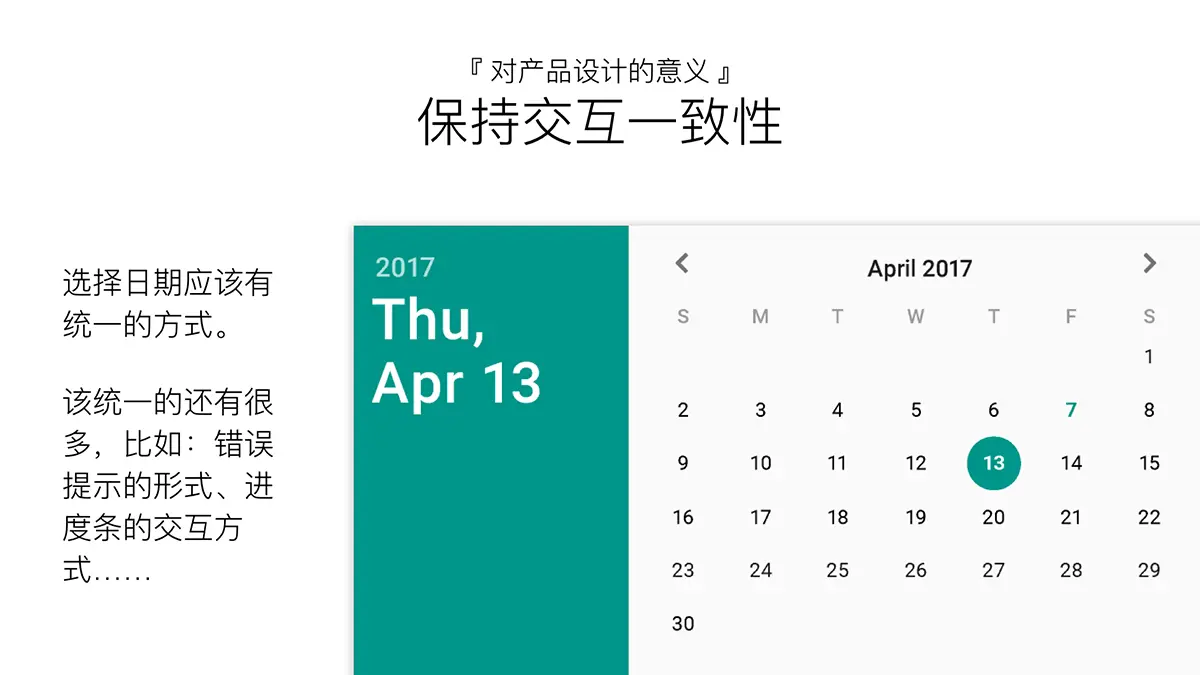 交互的一致性,或者说可预测性,是用户体验的根本。比如日期选择组件,在整个产品中就应该只有一种存在形式。如果一会儿是滚轮拨盘,一会儿是日历,一会儿又是下拉列表,这样的设计绝对是不能上线的。