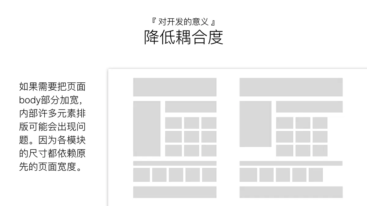 举个例子,如果要把页面的body区域加宽。内部许多元素因为浮动、固定宽度、百分比宽度、文字行数减少等等,布局会乱套。就像这图里这样,这是因为内部模块的样式对页面父级元素存在依赖和继承。