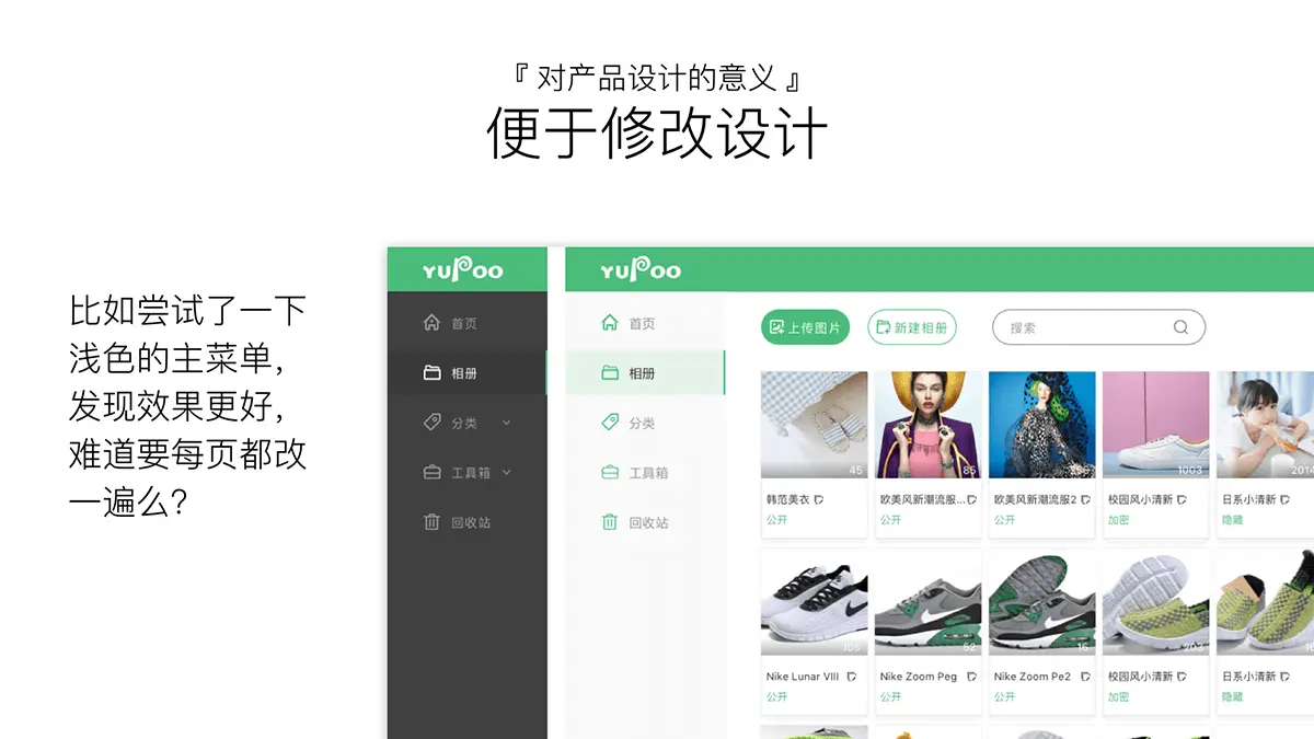 比如管理后台的界面,左侧的主导航是全站通用的。某天决定要给它换一套浅色的设计,难道每个PSD都改一遍吗?如果产品逻辑复杂,PSD有上百个呢?