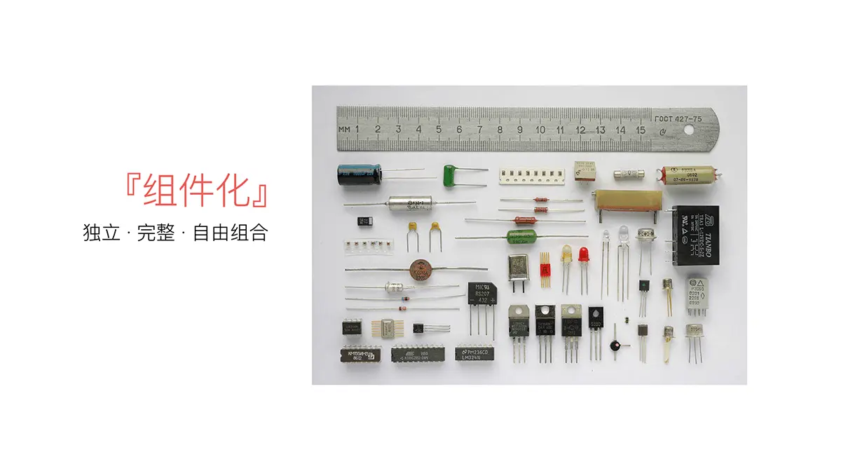 组件化的工作方式信奉独立、完整、自由组合。目标就是尽可能把设计与开发中的元素独立化,使它具备完整的局部功能,通过自由组合来构成整个产品。