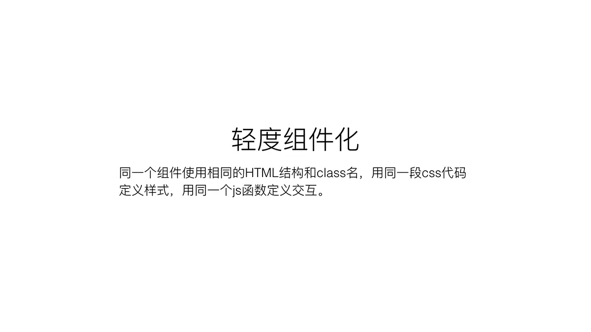 先讲讲轻度组件化。它的主要思想是使用相同的html结构和特定的class名,并且用同一段css代码定义样式,用同一个js函数来定义交互。