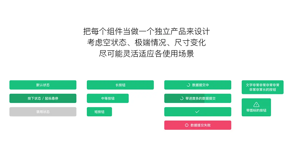 就拿按钮来说,我们必须考虑它的各种状态、极端情况、尺寸变化,还有所有附带的交互效果。这才能称之为一个独立完整的组件,满足其他组件对一个按钮的所有要求。