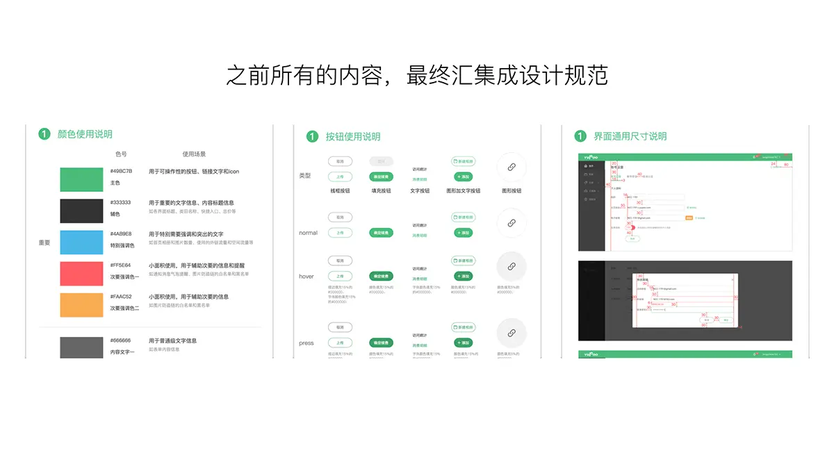 以上这些工作,沉淀下来,就成了设计规范。这套文档对项目中的其他设计师是莫大的帮助,也是开发人员重要的资料。