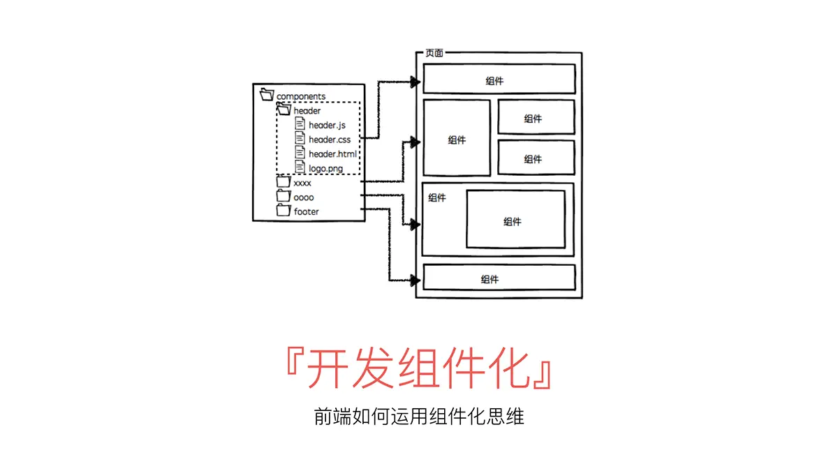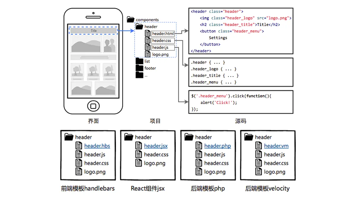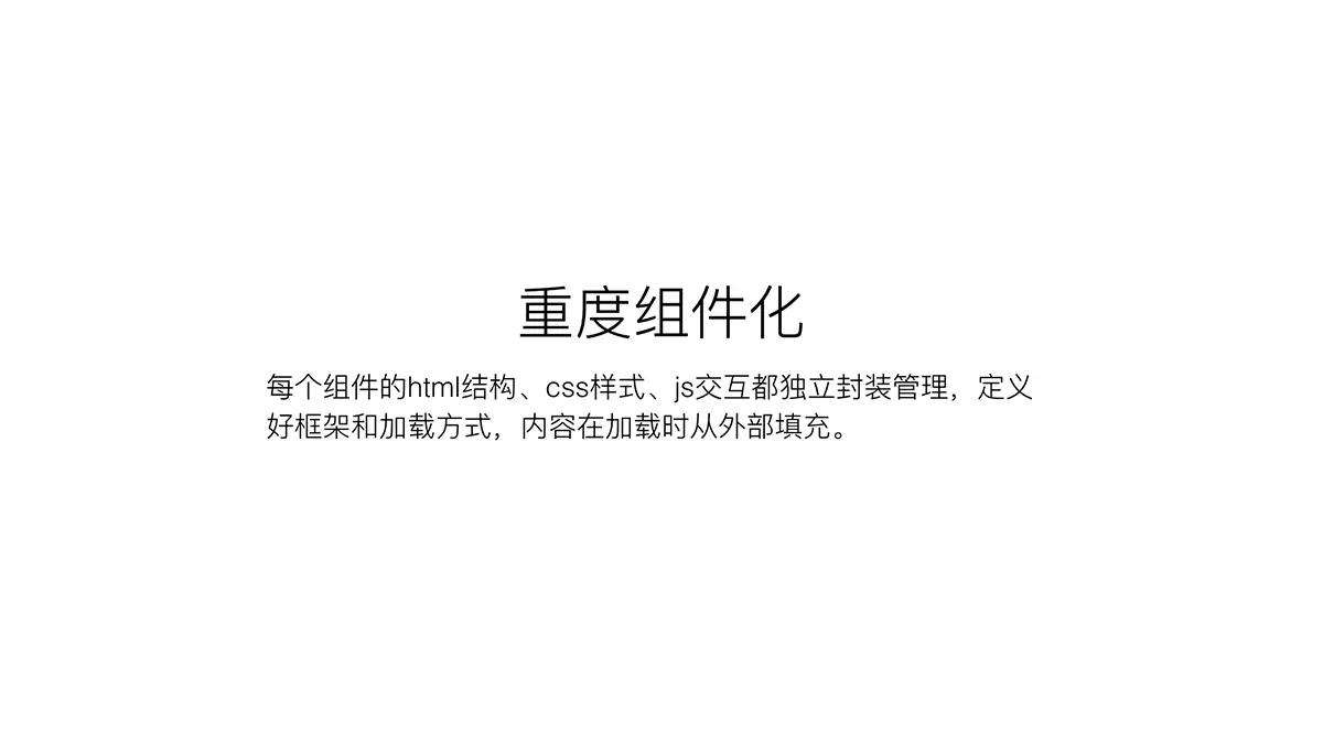 每个组件的html结构、css样式、js交互都独立封装管理,定义好框架和加载方式,内容在加载时从外部填充。