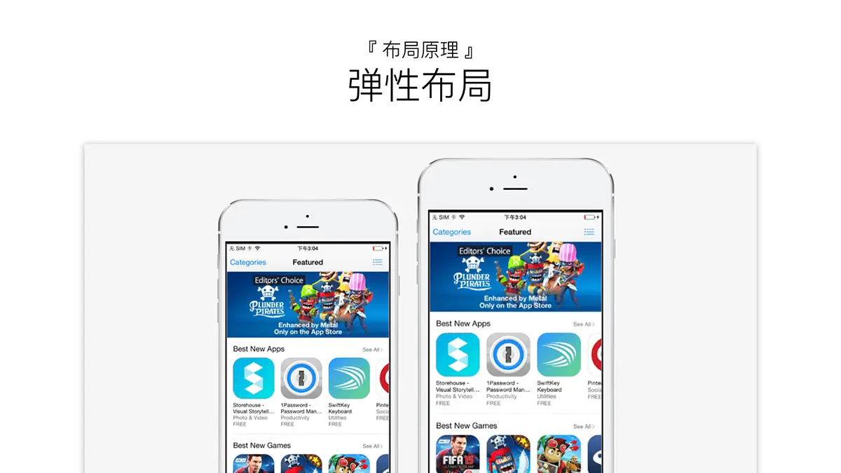 看图中的App store界面,在iPhone 7和7 plus上略有不同。虽然布局形式类似,但7上面只能看到一张banner,而7 plus则能看到左右两边banner露出来。而且App展示区域里,7上能看到3列多一点,7 plus则能看到4列多。屏幕大则视野更大,能显示更多内容,这是流式布局的思想。
