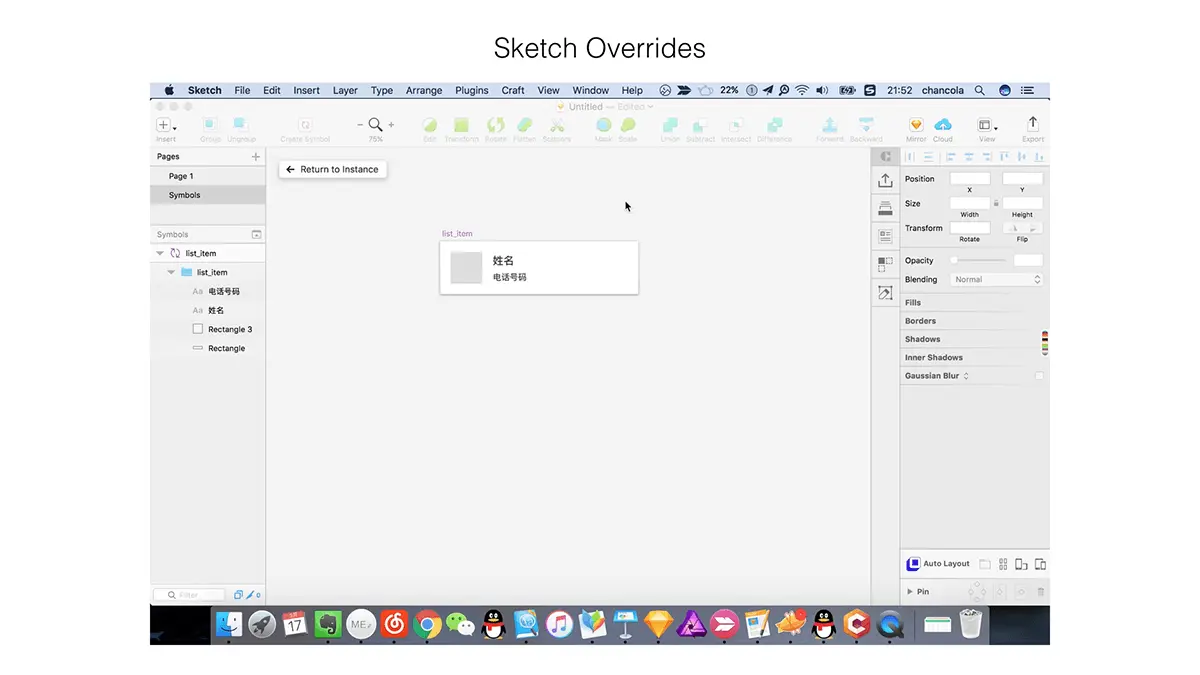 还是刚才的组件,不过我把头像右边代表两行文字的矩形换成了真正的文字,我要把它当作通讯录界面来设计。现在我们回到列表界面,发现列表里每一项都变成了姓名+电话号码。然后我们在每一项的Overrides选项中输入数据,因为这是在组件之外输入的信息,它只会影响那一条内容。用这种方式把每个列表项都填上数据。现在我们再进到组件里,做点样式修改,比如把电话号码颜色改成灰色。回到列表,所有电话号码都变灰了,内容保持不变。