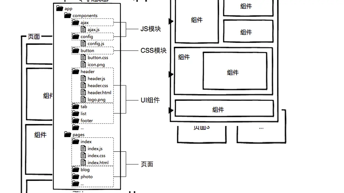 一个应用由大量页面组成。一个页面的绝大部分都是组件。组件内部已经定义好了完整的结构,可以独立运行。纵观整个项目,可能就会是这样一个结构。组件的代码占了大多数,能共用的都尽量共用,各个页面的特殊代码则会变得非常轻。各功能模块的划分清晰明确,一目了然。