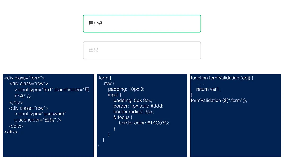 我们来看看上面这个登录框,下面3个代码块是它大致的代码结构。输入框在其他页面肯定也会用到,那么只需要与左边框里的html结构保持一致。各处页面代码中引用同一个css和js文件,至少做到了在一处集中管理样式与交互。但如果组件的html结构发生变化,修改的工作量还是会比较大。