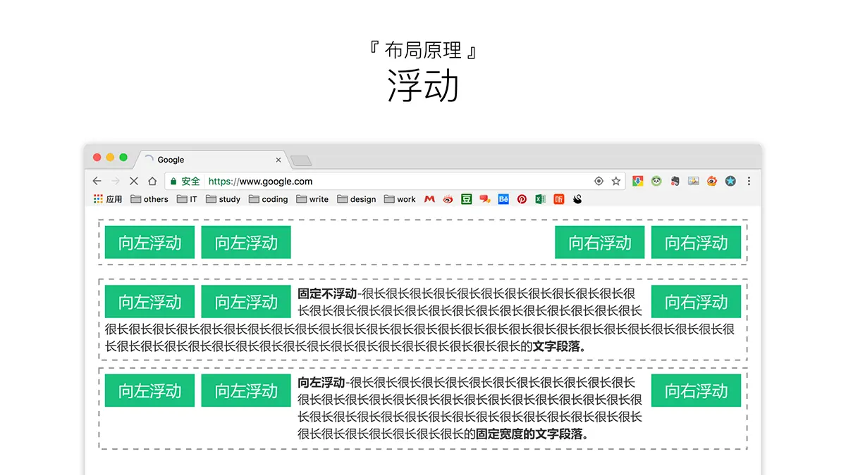 第二行和第三行是一组对比,表现了非浮动元素与浮动元素混合排列时的规则。第二行的文字是一个常规布局的元素,可以看到左右浮动的元素各就各位,常规布局的文字很灵活地填充空隙,就像报纸排版一样。而第三行里的情况,文字段落也加上左浮动属性,并且限定宽度,它就会跟在左浮动元素的右侧。