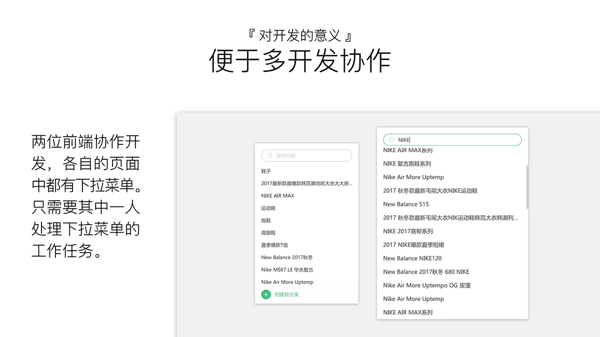 如果两个开发同学都在制作带有下拉菜单的页面,这部分工作只要交给其中一人就行了。TA做好之后封装成组件,另一位开发在自己的页面中加载就行了。