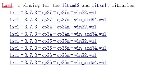 如果下载的安装包是"Twisted-17.1.0-cp35-cp35m-win_amd64.whl",则调用命令pip install Twisted-17.1.0-cp35-cp35m-win_amd64.whl - Lxml在Windows环境下安装失败,与Twisted情况相似。需要手动下载安装包。www.lfd.uci.edu/~gohlke/pyt…。