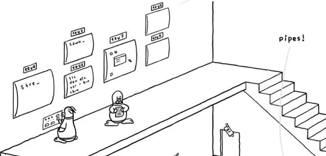 在图片的中部,有两个小企鹅扛着管道(PipeLine)在行走,一只小企鹅可以把自己手上的东西通过这个管道,传递给后面的小企鹅。不过怎么看起来前面这种(男?)企鹅累得满头大汗,而后面那只(女?)企鹅似乎游刃有余——喂喂,前面那个,裤子快掉了~