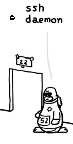 而在最右侧的一个门牌号 22 的们的待遇就大为不同,居然有一只带着墨镜的小企鹅在守着,看起来好酷啊,它是黑衣人叔叔吗?为什么要这么酷的一个企鹅呢,因为 22 端口是 SSH 端口,是一个非常重要的远程连接端口,通常通过这个端口进行远程管理,所以对这个端口进来的人要仔细审查。
