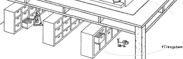 地基(底层)由一排排的文件柜组成,井然有序,文件柜里放置着“文件”——电脑中的文件。左上角,有一只胸前挂着 421 号牌的小企鹅,它表示着 PID(进程 ID) 为 421 的进程,它正在查看文件柜中的文件,这代表系统中正有一个进程在访问文件系统。在右下角有一只小狗,它是看门狗 ,这代表对文件系统的监控。