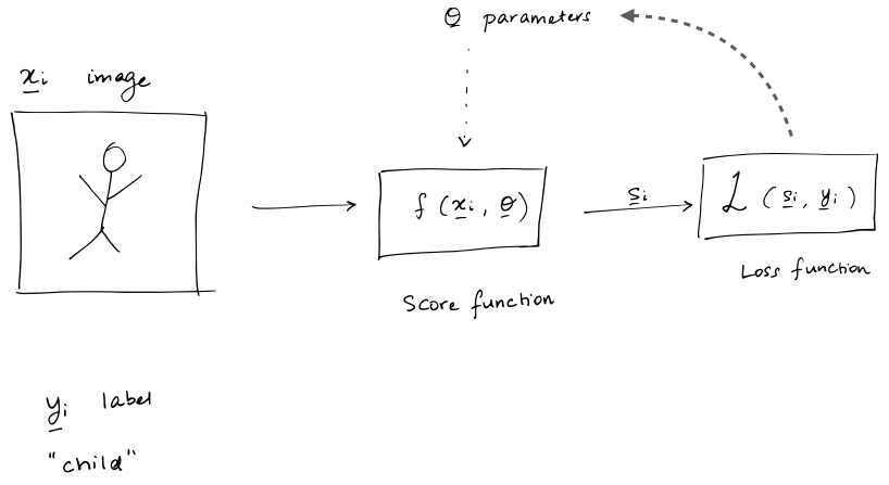 我们有很多标记好的图片,现在我们要去找一个score函数,即评分函数,能够对输入的图片给出一个打分,告诉我们是哪个分类的分值最高,接着我们有一个评价函数Loss去评判分类的好坏,如果分类不好,我们会有一个优化函数去优化score中的变数,然后重新进行分类,直到我们的Loss符合我们的预期