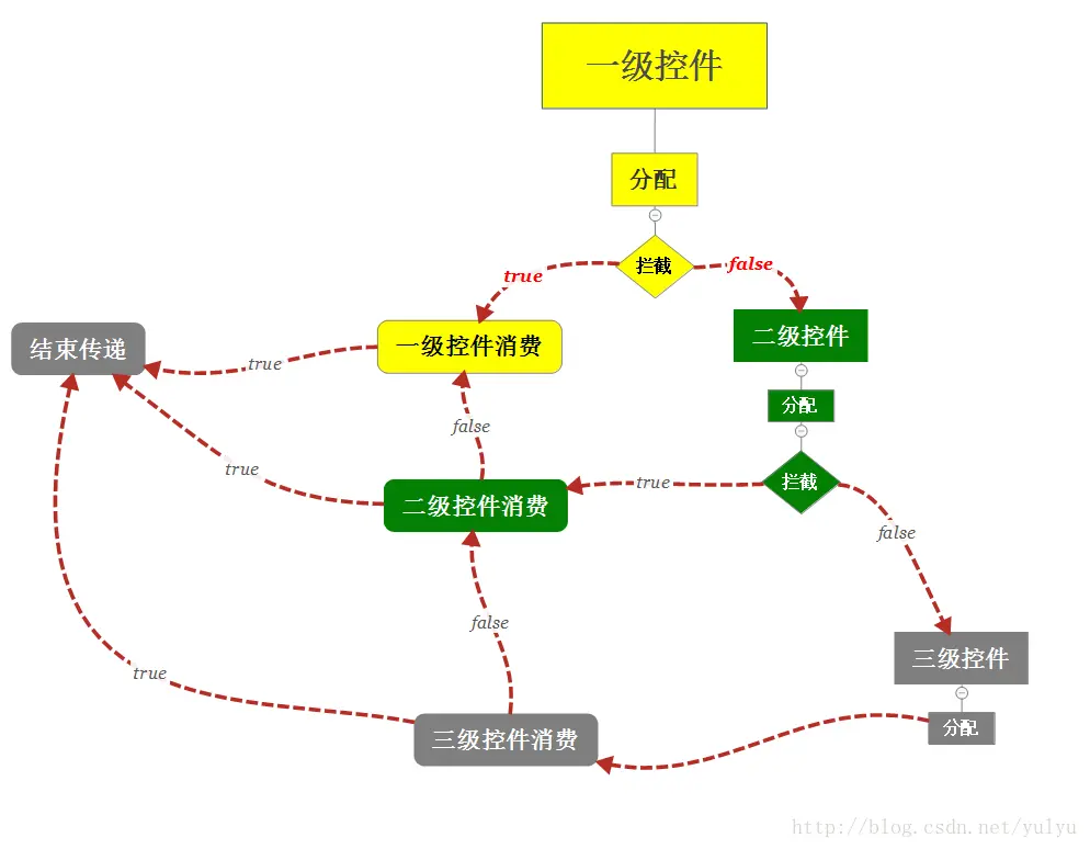 (3)事件从上往下分配时,要么是走到某一层被拦截了,要么是走到最底层了才会停止向下分配