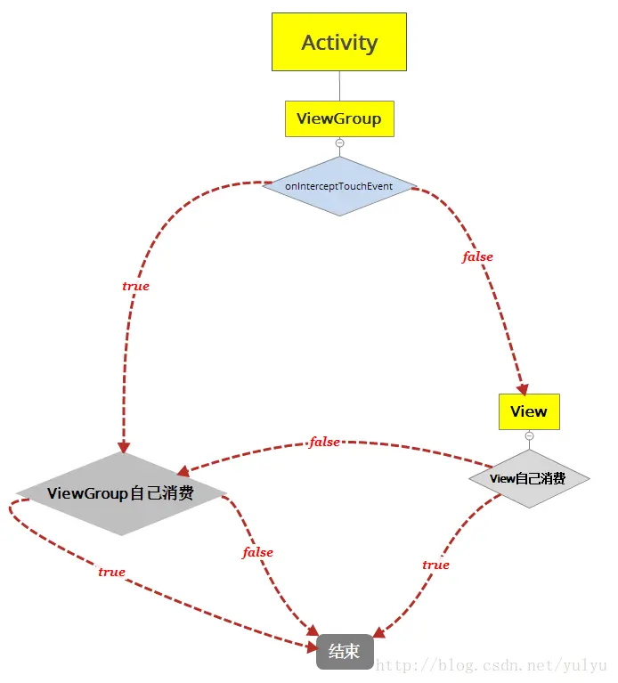 OnTouchListener虽然优先于onTouchEvent,但都属于同一层的消费,在这里我们就不分开来描述了,统一描述为自己消费