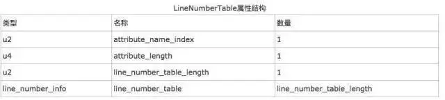 line_number_table是一个数量为line_number_table_length,类型为line_number_info的集合,line_number_info表包括了start_pc和line_number两个u2类型的数据项,前者是字节码行号,后者是Java源码行号