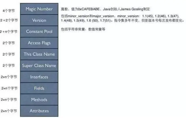 这张图是一张java字节码的总览图,我们也就是按照上面的顺序来对字节码进行解读的。一共含有10部分,包含魔数,版本号,常量池等等,接下来我们按照顺序一步一步解读。