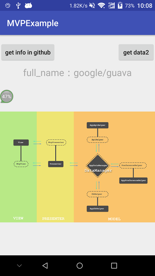 在点下按钮执行开始下载任务的时候,View(Activity)中没有具体的实现,只是调用了Presenter中的onRequest方法,而Presenter中的onRequest又会去通过DataManager调用Model的getGithubDatad方法,Model又会在根据具体逻辑(在这里就是Http请求)的状态去调用Presenter中的方法,例如我们在AsyncTask的结果回调方法中,调用mGithubCallback.callbackSuceed(t);时,就会去调用Presenter的具体实现。