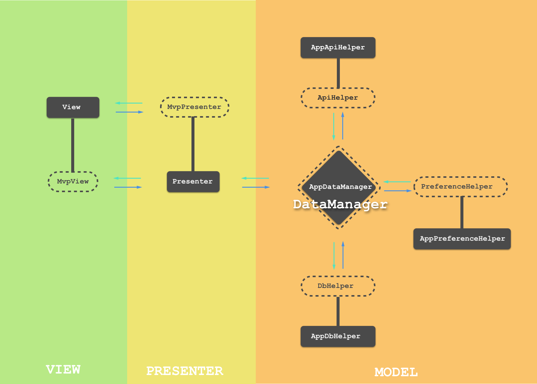 在这里其实Presenter不直接控制Model层数据操作,而是Presenter通过DataManager间接操作model数据层,只要目的是集中管理Model数据操作,