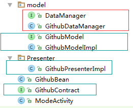 从上图可以看出项目结构主要分为 model层接口和实现,DataManager接口和实现,presenter和view的接口集合(GithubContract),和presenter层实现,以及view层activity。图二中虚线所表示的指接口,所以虚线相对应的实线部分就是实现类。