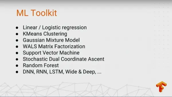 在TensorFlow中有一些高兴的机器学习的算法实现,如LR, SVM、 Random Forest,在TF.Learn中有很多常用的机器学习算法的实现,用户可以很快的使用,而且API风格和scikit-learn很类似,而且在后续的video提到会有分布式的支持。