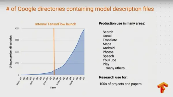 TensorFlow在Google内部项目应用的增长也十分迅速:在Google多个产品都有应用如:Gmail,Google Play Recommendation, Search, Translate, Map等等;有将近100多project和paper使用TensorFlow做相关工作